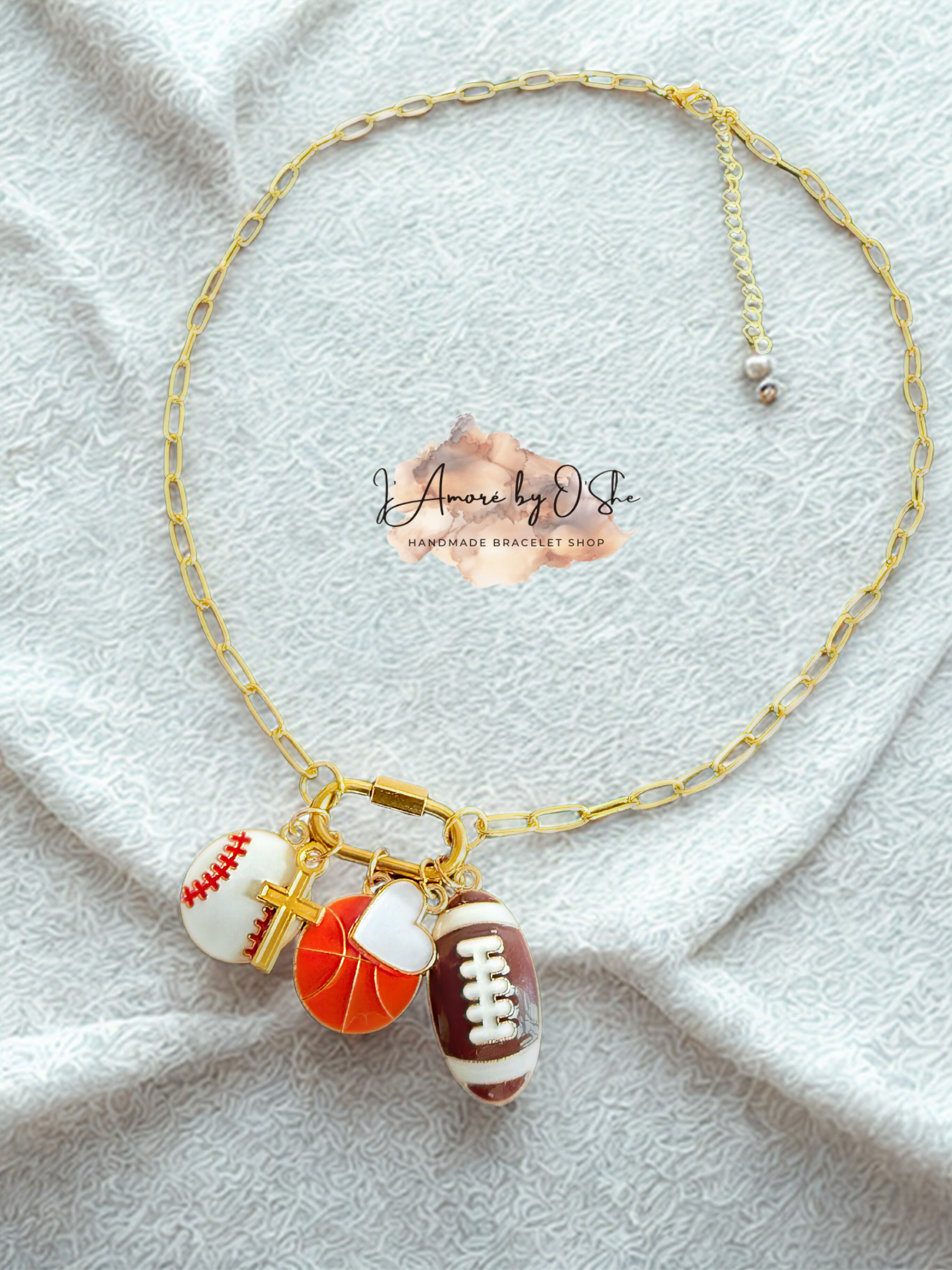 Celebrate every role you play — from prayer warrior to proud sports mom — with the Sideline Faith Necklace. Featuring a mix of interchangeable charms, including a cross, heart, and multiple sports symbols, this necklace was designed to carry both your faith and your game-day pride. Its gold chain and bold charms make it versatile enough for the stands, church, or everyday wear.
